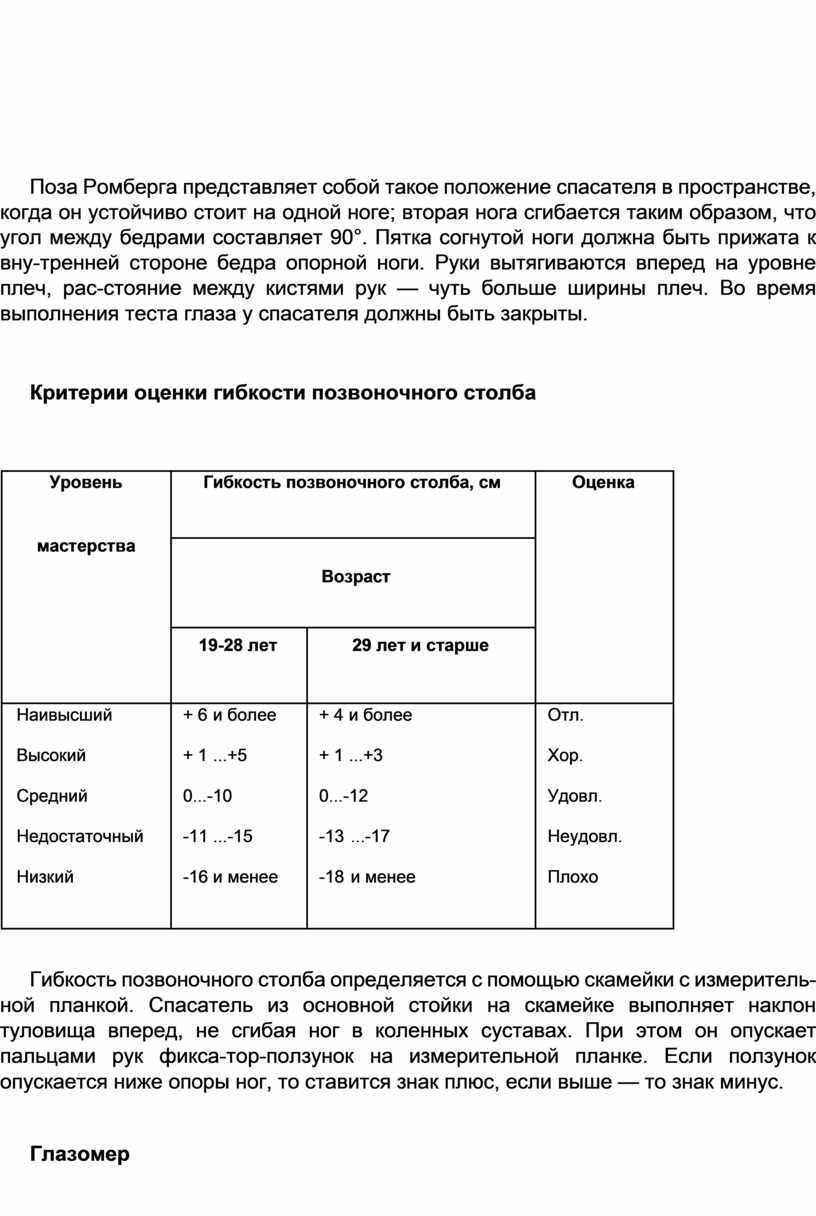 Гибкость позвоночного столба определяется с помощью скамейки с измеритель-ной планкой. Спасатель из основной стойки на скамейке выполняет наклон туловища вперед, не сгибая ног в коленных суставах. При этом он опускает пальцами рук фикса-тор-ползунок на измерительной планке. Если ползунок опускается ниже опоры ног, то ставится знак плюс, если выше — то знак минус.