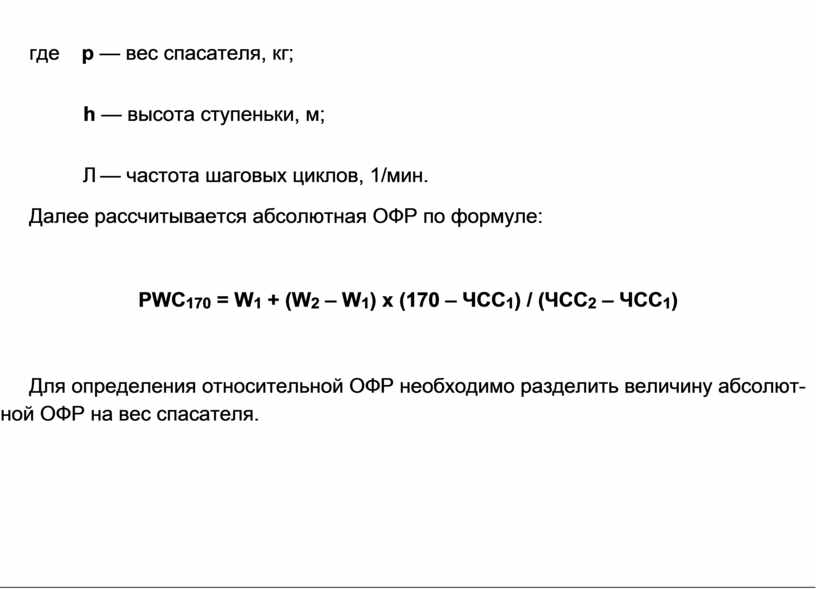 Общая физическая работоспособность определяется с использованием степ-теста методом PWC170 . Во время эксперимента спасатель два раза подвергается воздействию нагрузки разной мощности. В первом случае он «попеременно», то на левой, то на правой ноге поднимается на ступеньку высотой 0,45 м и опуска-ется с нее на уровень земли с частотой 22,5 шаговых циклов в минуту; во втором случае — с частотой 30-40 шаговых циклов в минуту. В обоих случаях после воз-действий нагрузки у спасателя производится замер частоты сердечных сокраще-ний — ЧСС1 и ЧСС2. Упражнение выполняется без перерыва соответственно 3 и 2 минуты. По результатам замеров рассчитываются мощности: первой нагрузки — W1 и второй нагрузки — W2 по формуле: