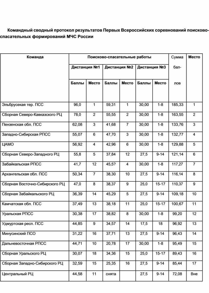 Командный сводный протокол результатов Первых Всероссийских соревнований поисково-спасательных формирований МЧС России