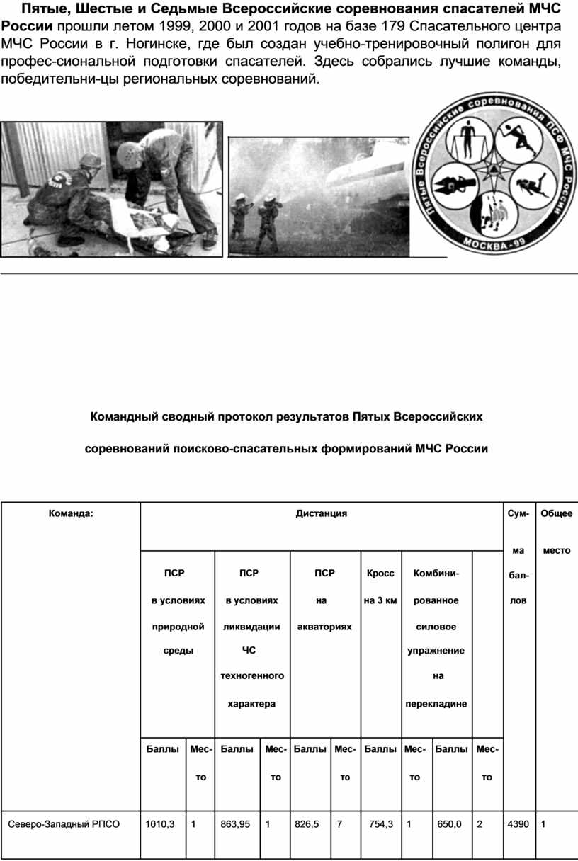 Пятые, Шестые и Седьмые Всероссийские соревнования спасателей МЧС России прошли летом 1999, 2000 и 2001 годов на базе 179 Спасательного центра МЧС России в г. Ногинске, где был создан учебно-тренировочный полигон для профес-сиональной подготовки спасателей. Здесь собрались лучшие команды, победительни-цы региональных соревнований.