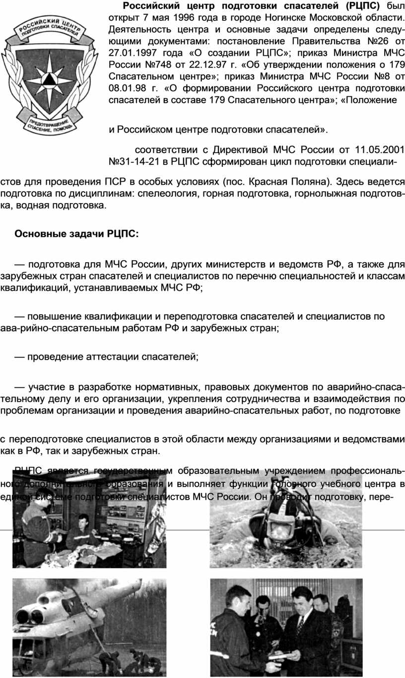 Российский центр подготовки спасателей (РЦПС) был открыт 7 мая 1996 года в городе Ногинске Московской области. Деятельность центра и основные задачи определены следу-ющими документами: постановление Правительства №26 от 27.01.1997 года «О создании РЦПС»; приказ Министра МЧС России №748 от 22.12.97 г. «Об утверждении положения о 179 Спасательном центре»; приказ Министра МЧС России №8 от 08.01.98 г. «О формировании Российского центра подготовки спасателей в составе 179 Спасательного центра»; «Положение