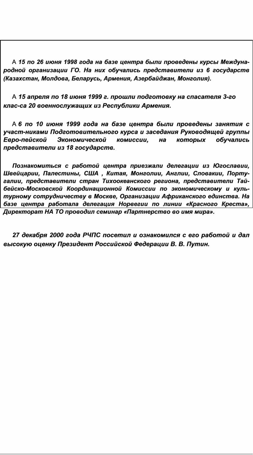 А 15 апреля по 18 июня 1999 г. прошли подготовку на спасателя 3-го клас-са 20 военнослужащих из Республики Армения.