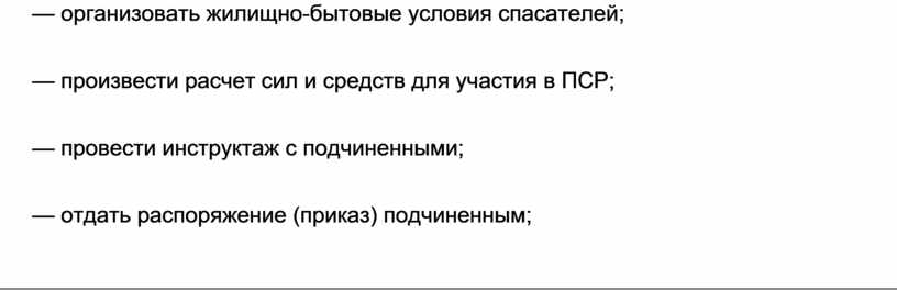 Г принятие решения, выдачу команд, обеспечение условий для их выполнения, кон-троль, внесение изменений в первоначальный план, поощрение, наказание, отчет-ность. Руководство всеми силам и средствами, принимающими участие в ПСР, органи-зацию их взаимодействия, обеспечение безопасных условий осуществляет руководи-тель ПСР. Руководитель принимает окончательное решение. Он несет персональную ответственность за принятое решение.