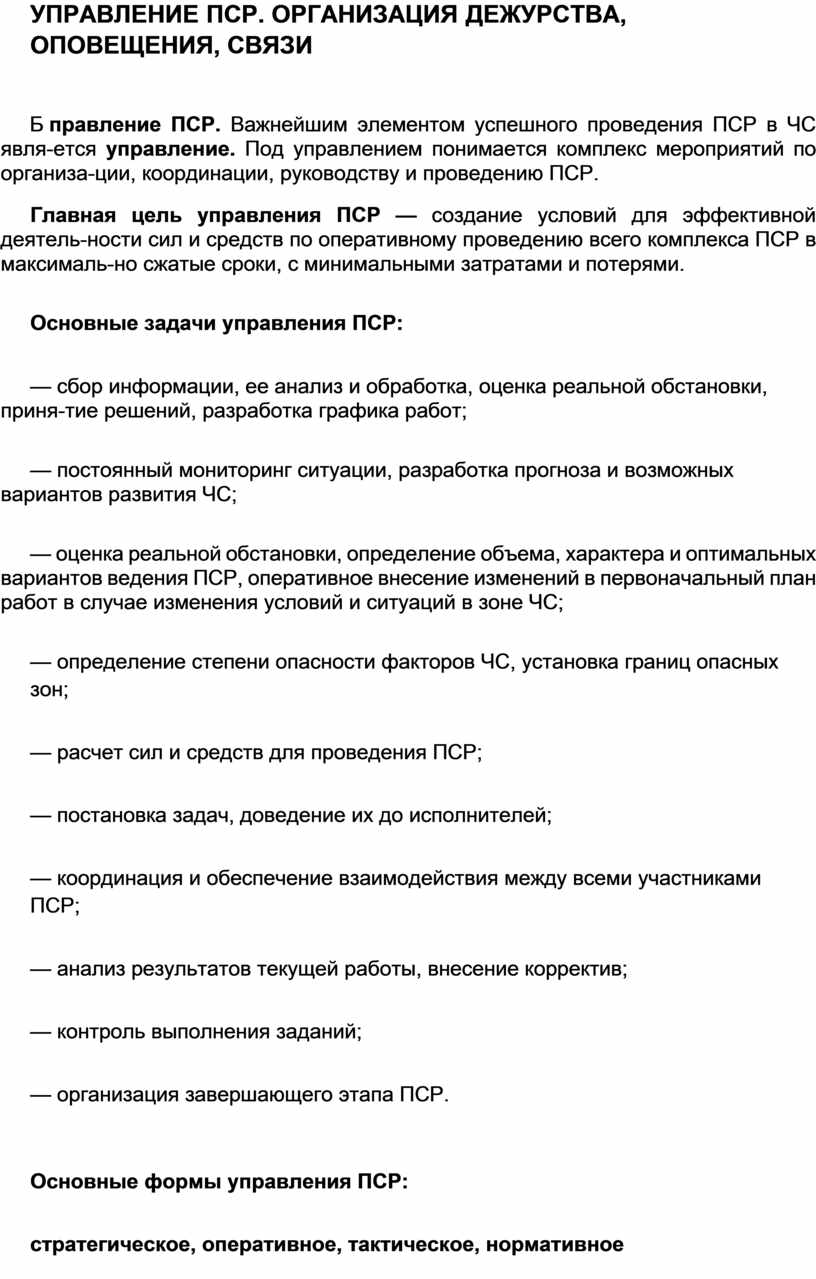 УПРАВЛЕНИЕ ПСР. ОРГАНИЗАЦИЯ ДЕЖУРСТВА, ОПОВЕЩЕНИЯ, СВЯЗИ