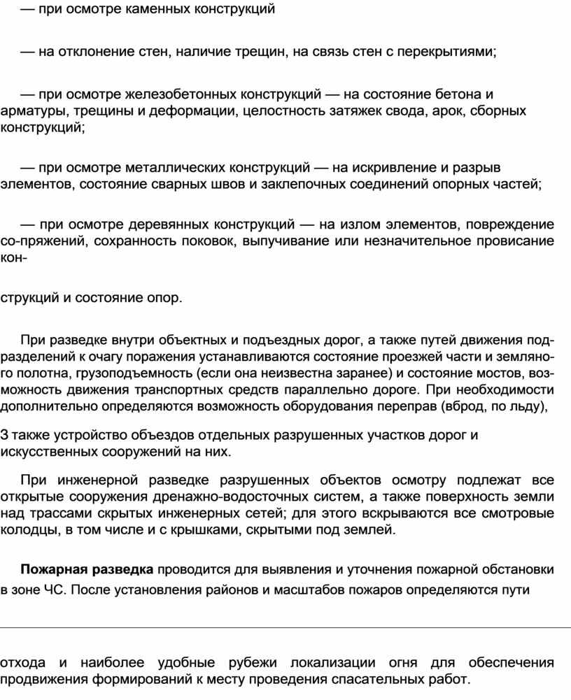 При разведке внутри объектных и подъездных дорог, а также путей движения под-разделений к очагу поражения устанавливаются состояние проезжей части и земляно-го полотна, грузоподъемность (если она неизвестна заранее) и состояние мостов, воз-можность движения транспортных средств параллельно дороге. При необходимости дополнительно определяются возможность оборудования переправ (вброд, по льду),