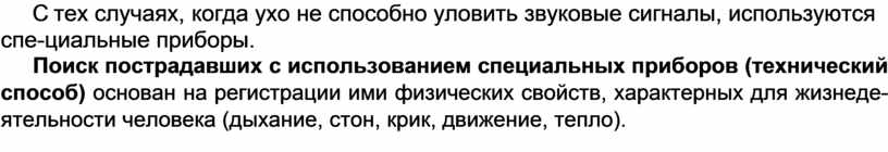 Поиск пострадавших с использованием специальных приборов (технический способ) основан на регистрации ими физических свойств, характерных для жизнеде-ятельности человека (дыхание, стон, крик, движение, тепло).