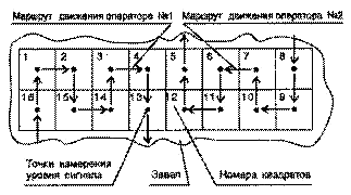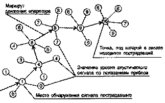 Последовательность перемещения оператора и измерение уровня сигнала при оп-ределении местоположения пострадавшего показаны на следующем рисунке.
