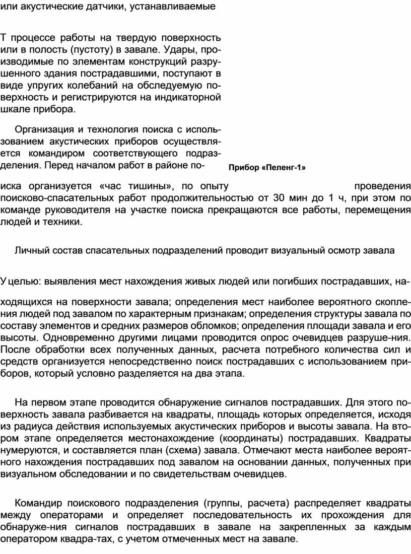 ходящихся на поверхности завала; определения мест наиболее вероятного скопле-ния людей под завалом по характерным признакам; определения структуры завала по составу элементов и средних размеров обломков; определения площади завала и его высоты. Одновременно другими лицами проводится опрос очевидцев разруше-ния. После обработки всех полученных данных, расчета потребного количества сил и средств организуется непосредственно поиск пострадавших с использованием при-боров, который условно разделяется на два этапа.
