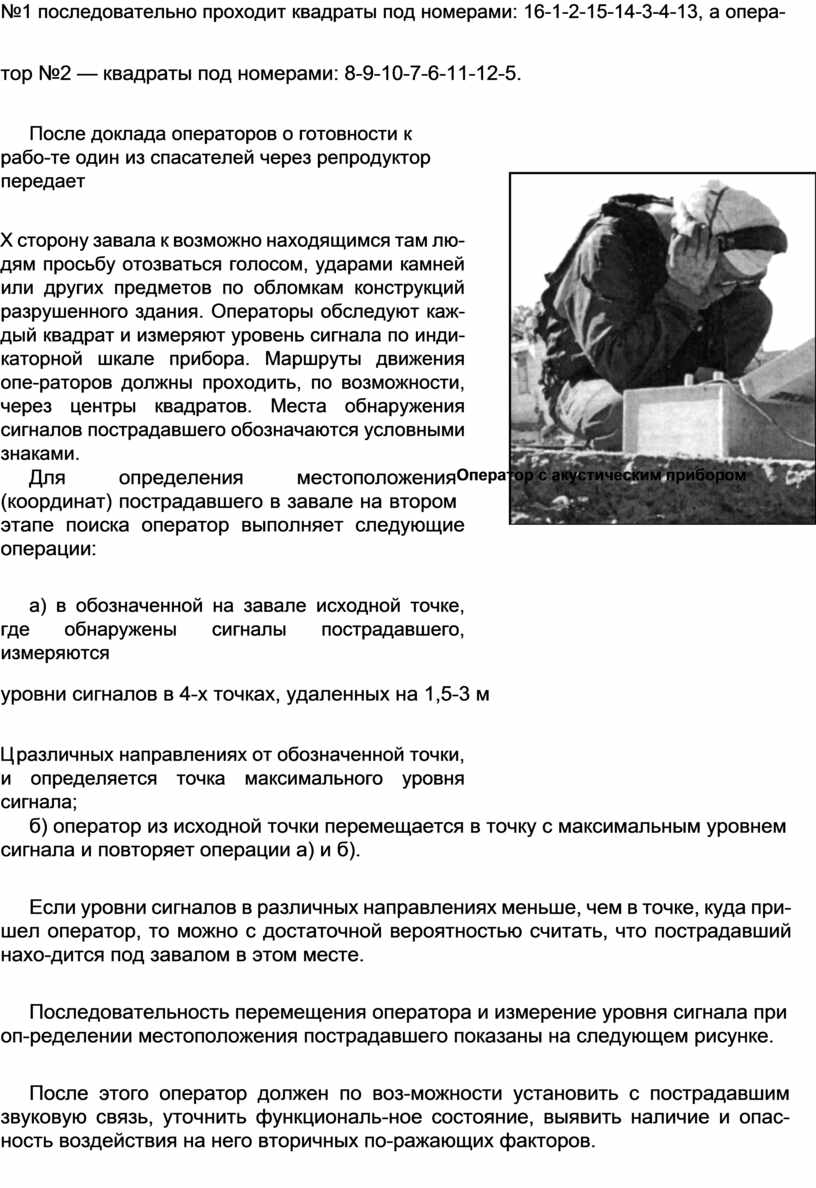 Х  сторону завала к возможно находящимся там лю-дям просьбу отозваться голосом, ударами камней или других предметов по обломкам конструкций разрушенного здания. Операторы обследуют каж-дый квадрат и измеряют уровень сигнала по инди-каторной шкале прибора. Маршруты движения опе-раторов должны проходить, по возможности, через центры квадратов. Места обнаружения сигналов пострадавшего обозначаются условными знаками.