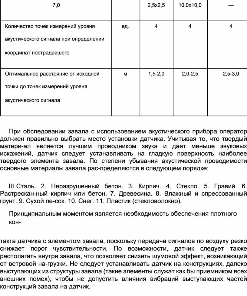 При обследовании завала с использованием акустического прибора оператор дол-жен правильно выбрать место установки датчика. Учитывая то, что твердый матери-ал является лучшим проводником звука и дает меньше звуковых искажений, датчик следует устанавливать на гладкую поверхность наиболее твердого элемента завала. По степени убывания акустической проводимости основные материалы завала рас-пределяются в следующем порядке: