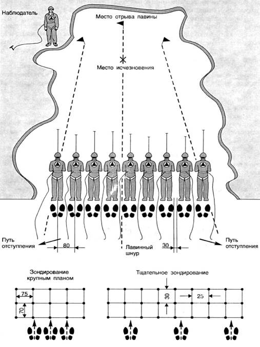 Ширина лежащего на боку человека составляет 30-35 см, поэтому зондирование должно проводиться с особой тщательностью. В нем принимают участие одновре-менно несколько человек. Они должны идти шеренгой, плечом к плечу. По команде старшего зондирование осуществляется сначала у носка левой ноги, затем между