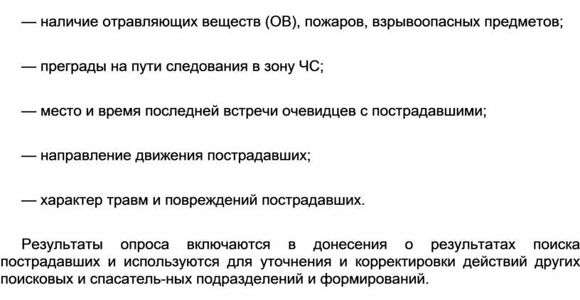 К наличие опасности воздействия на них вторичных поражающих факторов. В ходе опроса определяются местонахождение пострадавших, их количество, общее состоя-ние, наличие продуктов питания, средств жизнеобеспечения, направления движения, состояние подъездов (подходов), рельеф местности, наличие опасностей.