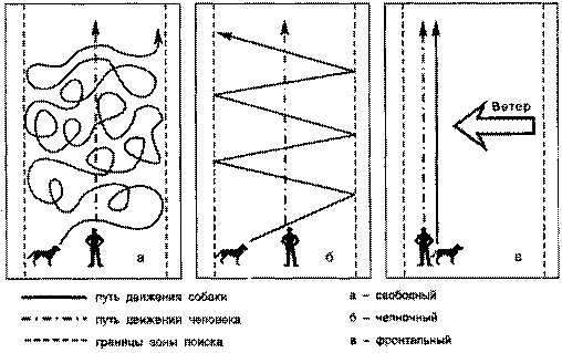 «Челночный» поиск дает возможность собакам использовать встречный ветер под разными углами. Два других приема — «веером» и «спиралью» — могут быть эффек-тивны в более сложной ветровой (климатической) обстановке.