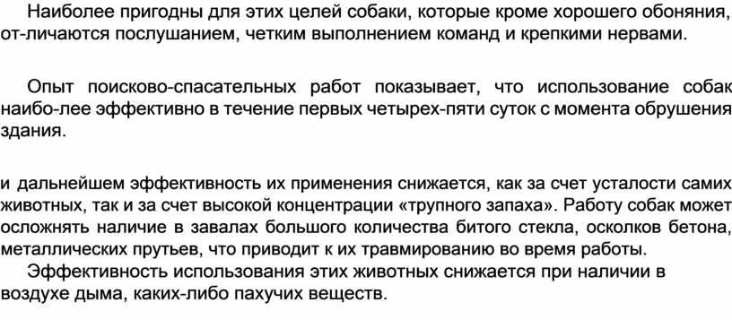 и дальнейшем эффективность их применения снижается, как за счет усталости самих животных, так и за счет высокой концентрации «трупного запаха». Работу собак может осложнять наличие в завалах большого количества битого стекла, осколков бетона, металлических прутьев, что приводит к их травмированию во время работы.
