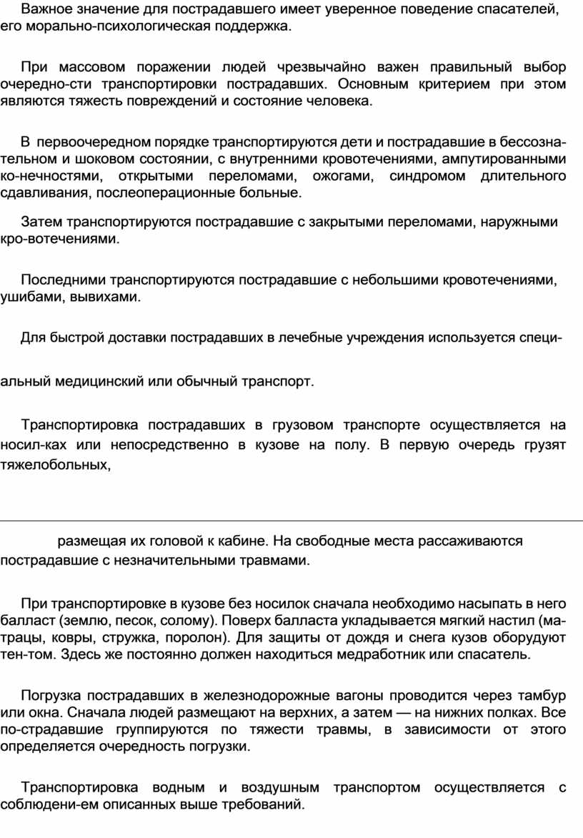 При массовом поражении людей чрезвычайно важен правильный выбор очередно-сти транспортировки пострадавших. Основным критерием при этом являются тяжесть повреждений и состояние человека.