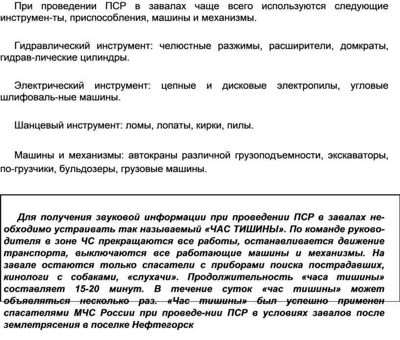Для получения звуковой информации при проведении ПСР в завалах не-обходимо устраивать так называемый «ЧАС ТИШИНЫ». По команде руково-дителя в зоне ЧС прекращаются все работы, останавливается движение транспорта, выключаются все работающие машины и механизмы. На завале остаются только спасатели с приборами поиска пострадавших, кинологи с собаками, «слухачи». Продолжительность «часа тишины» составляет 15-20 минут. В течение суток «час тишины» может объявляться несколько раз. «Час тишины» был успешно применен спасателями МЧС России при проведе-нии ПСР в условиях завалов после землетрясения в поселке Нефтегорск