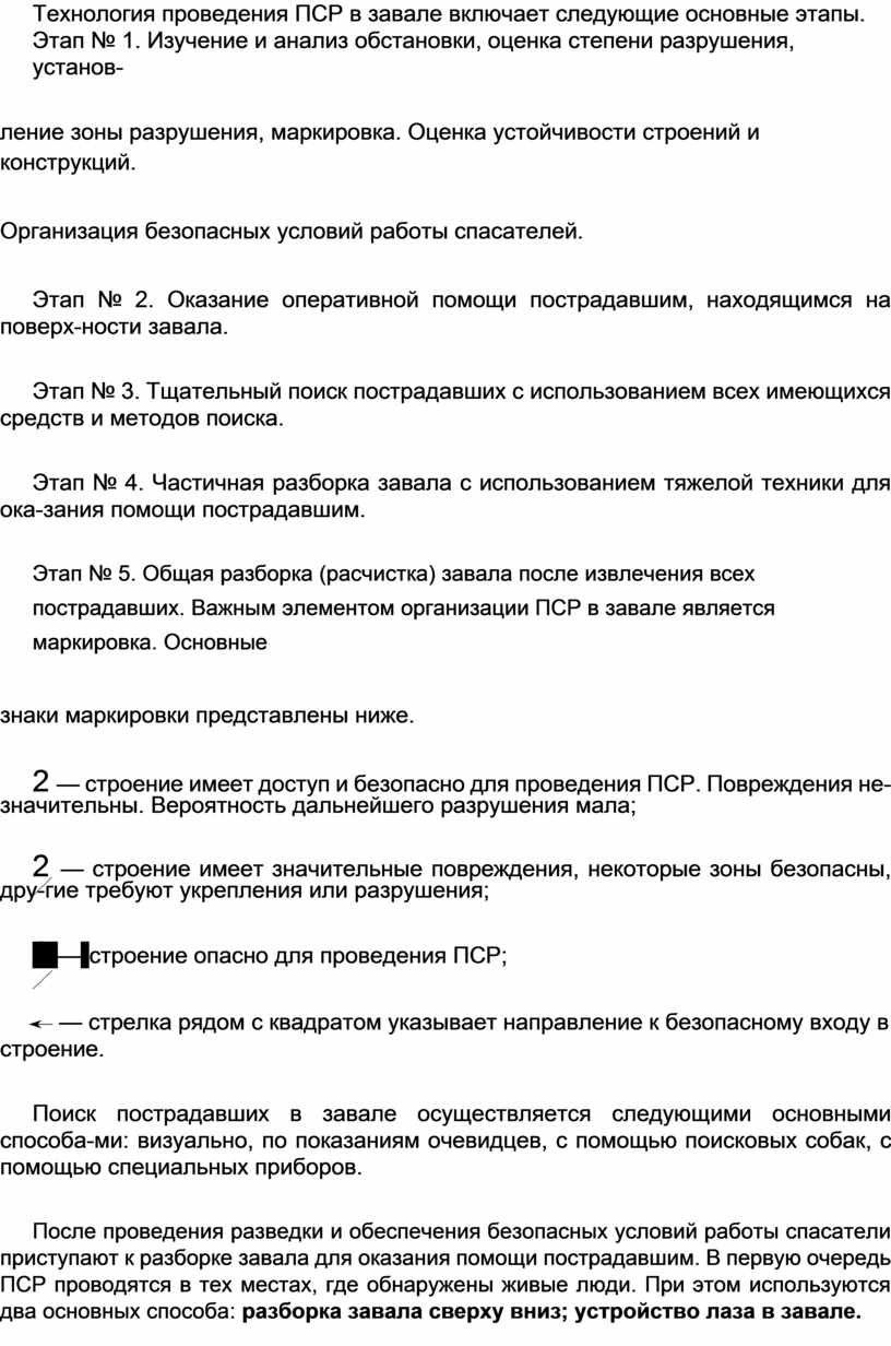 Технология проведения ПСР в завале включает следующие основные этапы. Этап № 1. Изучение и анализ обстановки, оценка степени разрушения, установ-