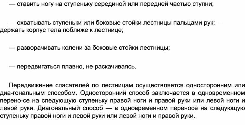Передвижение спасателей по лестницам осуществляется односторонним или диа-гональным способом. Односторонний способ заключается в одновременном перено-се на следующую ступеньку правой ноги и правой руки или левой ноги и левой руки. Диагональный способ — в одновременном переносе на следующую ступеньку правой ноги и левой руки или левой ноги и правой руки.