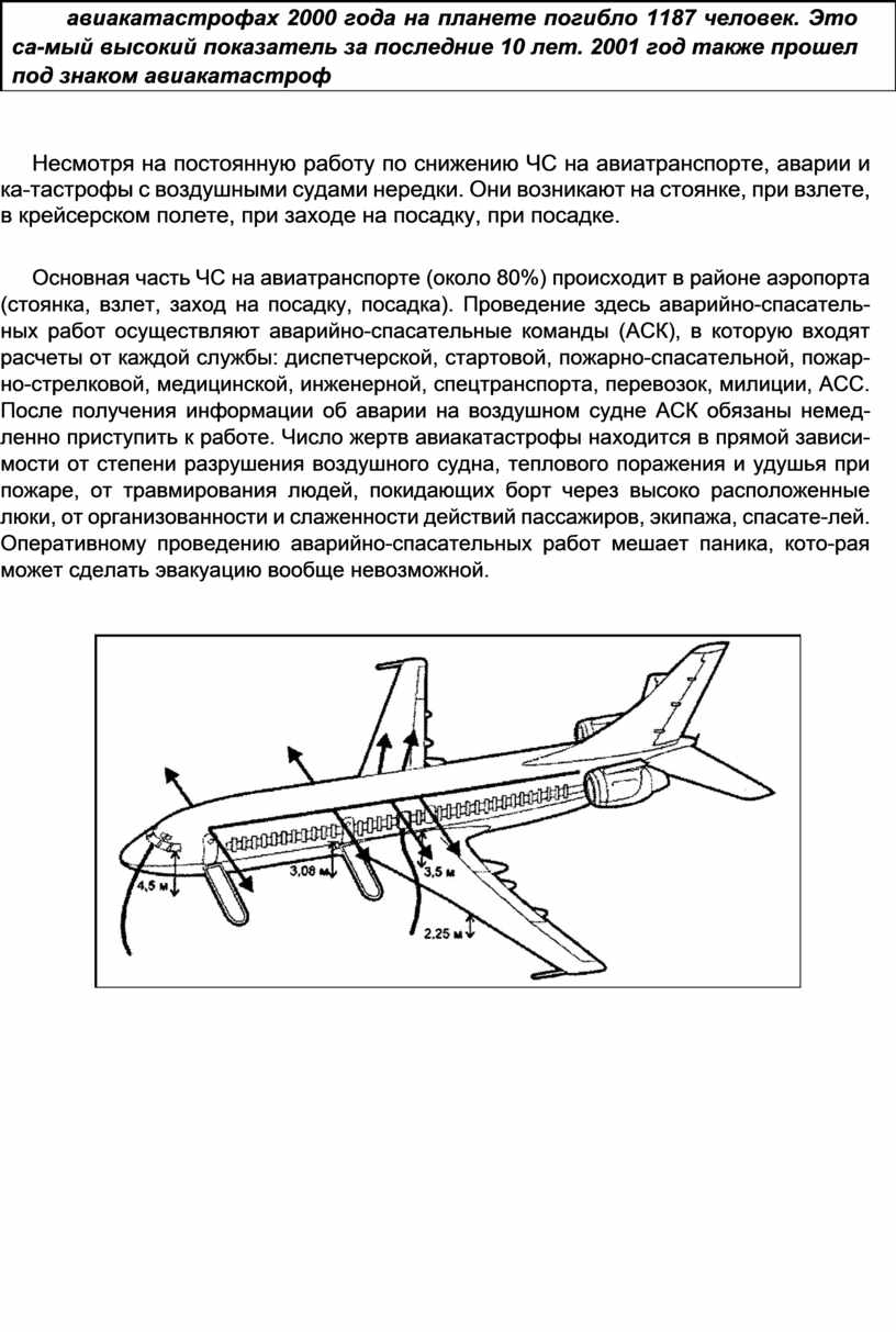 Основная часть ЧС на авиатранспорте (около 80%) происходит в районе аэропорта (стоянка, взлет, заход на посадку, посадка). Проведение здесь аварийно-спасатель-ных работ осуществляют аварийно-спасательные команды (АСК), в которую входят расчеты от каждой службы: диспетчерской, стартовой, пожарно-спасательной, пожар-но-стрелковой, медицинской, инженерной, спецтранспорта, перевозок, милиции, АСС. После получения информации об аварии на воздушном судне АСК обязаны немед-ленно приступить к работе. Число жертв авиакатастрофы находится в прямой зависи-мости от степени разрушения воздушного судна, теплового поражения и удушья при пожаре, от травмирования людей, покидающих борт через высоко расположенные люки, от организованности и слаженности действий пассажиров, экипажа, спасате-лей. Оперативному проведению аварийно-спасательных работ мешает паника, кото-рая может сделать эвакуацию вообще невозможной.