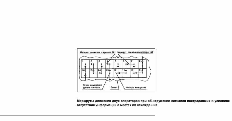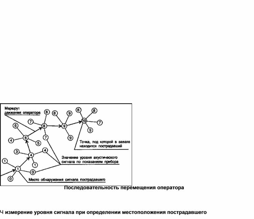 Последовательность перемещения оператора и измерение уровня сигнала при оп-ределении местоположения пострадавшего показаны на следующем рисунке.