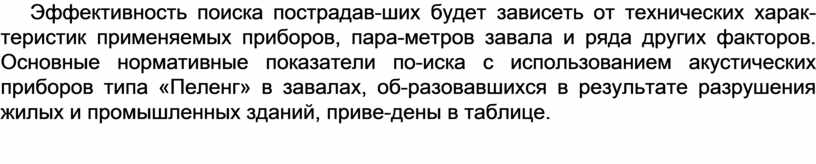 Эффективность поиска пострадав-ших будет зависеть от технических харак-теристик применяемых приборов, пара-метров завала и ряда других факторов. Основные нормативные показатели по-иска с использованием акустических приборов типа «Пеленг» в завалах, об-разовавшихся в результате разрушения жилых и промышленных зданий, приве-дены в таблице.