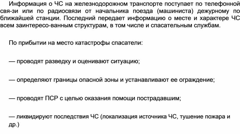 Информация о ЧС на железнодорожном транспорте поступает по телефонной свя-зи или по радиосвязи от начальника поезда (машиниста) дежурному по ближайшей станции. Последний передает информацию о месте и характере ЧС всем заинтересо-ванным структурам, в том числе и спасательным службам.