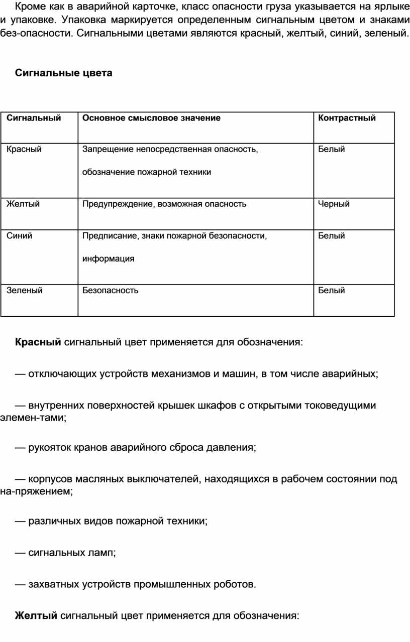 Кроме как в аварийной карточке, класс опасности груза указывается на ярлыке и упаковке. Упаковка маркируется определенным сигнальным цветом и знаками без-опасности. Сигнальными цветами являются красный, желтый, синий, зеленый.