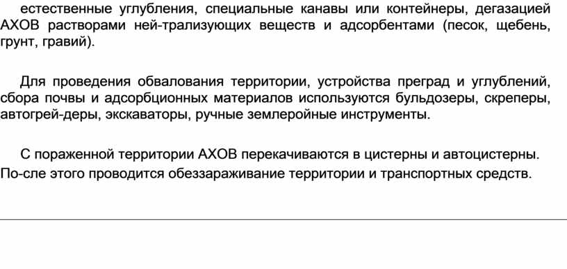 С пораженной территории АХОВ перекачиваются в цистерны и автоцистерны. По-сле этого проводится обеззараживание территории и транспортных средств.