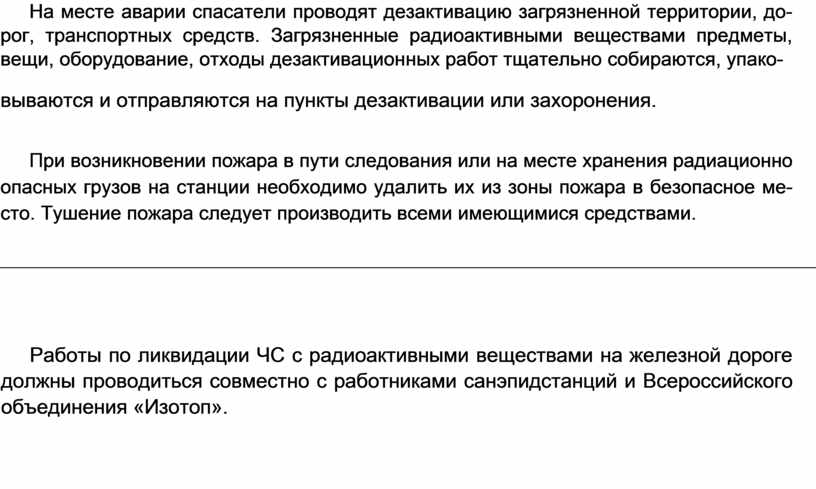 Работы по ликвидации ЧС с радиоактивными веществами на железной дороге должны проводиться совместно с работниками санэпидстанций и Всероссийского объединения «Изотоп».