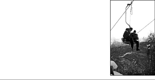 На кресельных подвесных канатных дорогах для опускания пострадавших на зем-лю при длительных остановках широко используется приспособление в виде легкой переносной тележки с пружинным тормозом и подвесной стремянкой. С опоры теле-жку устанавливают на канат, спасатель садится на стремянку и, отжимая «башмак» тормоза, самоходом или с помощью другого спасателя, идущего по земле, переме-щается с тележкой к ближайшему креслу. Спустившись по стремянке к пострадавше-му и надев на него спасательный пояс с лямками, охватывающими бедра, спасатель «стравливает» канат, проходящий через тормозную лебедку, которая удерживает пояс пострадавшего, до опускания последнего на землю. Переставив тележку через зажим кресла, спасатель передвигается к следующим пострадавшим.