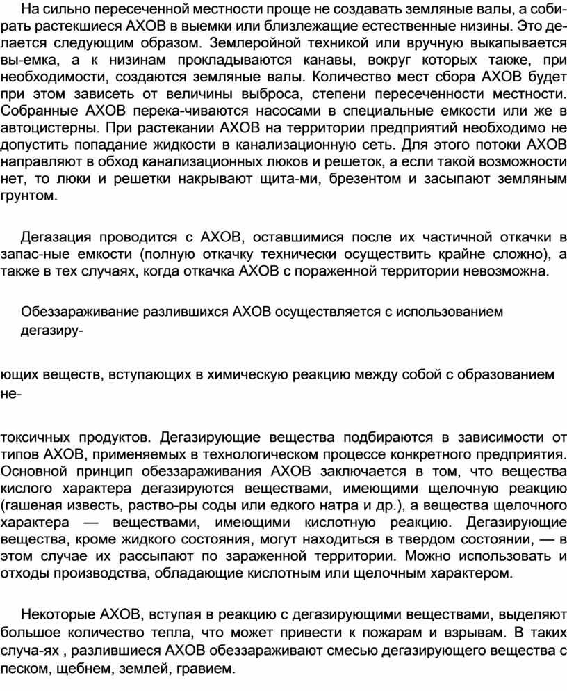 Некоторые АХОВ, вступая в реакцию с дегазирующими веществами, выделяют большое количество тепла, что может привести к пожарам и взрывам. В таких случа-ях , разлившиеся АХОВ обеззараживают смесью дегазирующего вещества с песком, щебнем, землей, гравием.