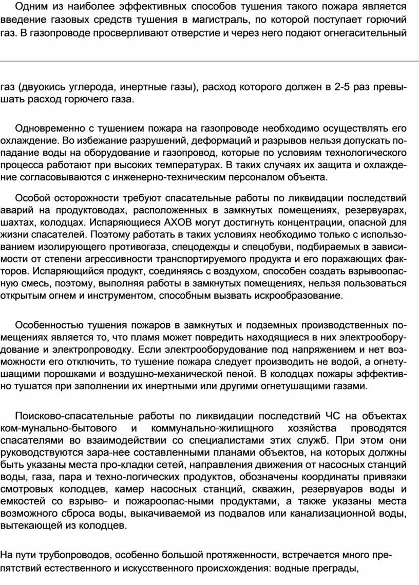 Особой осторожности требуют спасательные работы по ликвидации последствий аварий на продуктоводах, расположенных в замкнутых помещениях, резервуарах, шахтах, колодцах. Испаряющиеся АХОВ могут достигнуть концентрации, опасной для жизни спасателей. Поэтому работать в таких условиях необходимо только с использо-ванием изолирующего противогаза, спецодежды и спецобуви, подбираемых в зависи-мости от степени агрессивности транспортируемого продукта и его поражающих фак-торов. Испаряющийся продукт, соединяясь с воздухом, способен создать взрывоопас-ную смесь, поэтому, выполняя работы в замкнутых помещениях, нельзя пользоваться открытым огнем и инструментом, способным вызвать искрообразование.