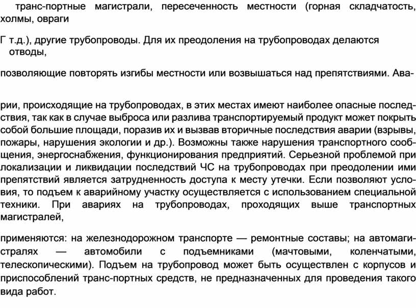 рии, происходящие на трубопроводах, в этих местах имеют наиболее опасные послед-ствия, так как в случае выброса или разлива транспортируемый продукт может покрыть собой большие площади, поразив их и вызвав вторичные последствия аварии (взрывы, пожары, нарушения экологии и др.). Возможны также нарушения транспортного сооб-щения, энергоснабжения, функционирования предприятий. Серьезной проблемой при локализации и ликвидации последствий ЧС на трубопроводах при преодолении ими препятствий является затрудненность доступа к месту утечки. Если позволяют усло-вия, то подъем к аварийному участку осуществляется с использованием специальной техники. При авариях на трубопроводах, проходящих выше транспортных магистралей,