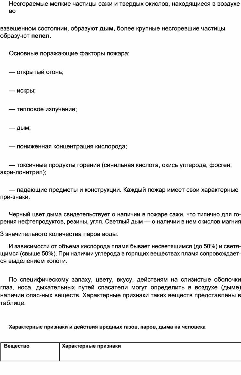 Характерные признаки и действия вредных газов, паров, дыма на человека