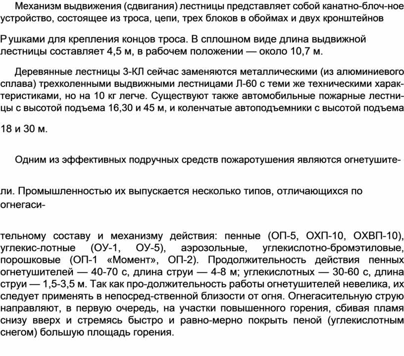Деревянные лестницы 3-КЛ сейчас заменяются металлическими (из алюминиевого сплава) трехколенными выдвижными лестницами Л-60 с теми же техническими харак-теристиками, но на 10 кг легче. Существуют также автомобильные пожарные лестни-цы с высотой подъема 16,30 и 45 м, и коленчатые автоподъемники с высотой подъема