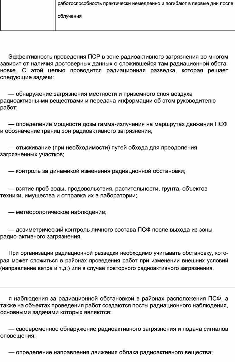 Эффективность проведения ПСР в зоне радиоактивного загрязнения во многом зависит от наличия достоверных данных о сложившейся там радиационной обста-новке. С этой целью проводится радиационная разведка, которая решает следующие задачи: