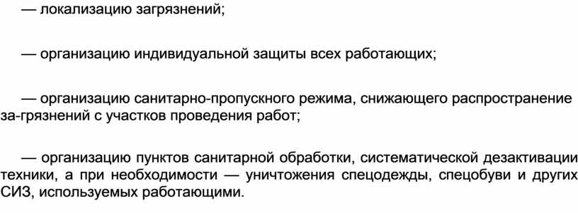 — организацию пунктов санитарной обработки, систематической дезактивации техники, а при необходимости — уничтожения спецодежды, спецобуви и других СИЗ, используемых работающими.