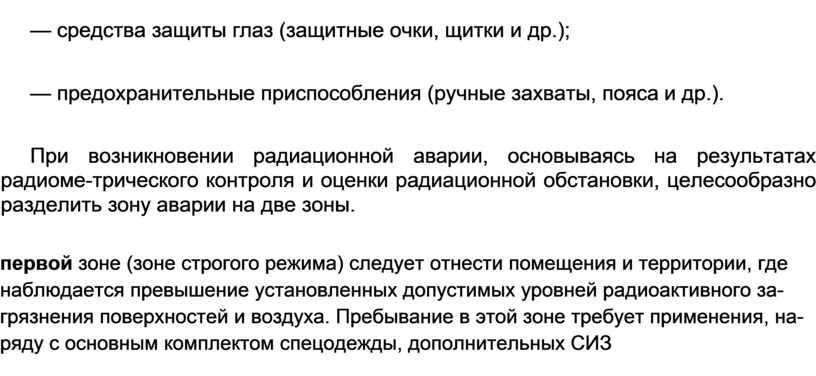 первой зоне (зоне строгого режима) следует отнести помещения и территории, где наблюдается превышение установленных допустимых уровней радиоактивного за-грязнения поверхностей и воздуха. Пребывание в этой зоне требует применения, на-ряду с основным комплектом спецодежды, дополнительных СИЗ