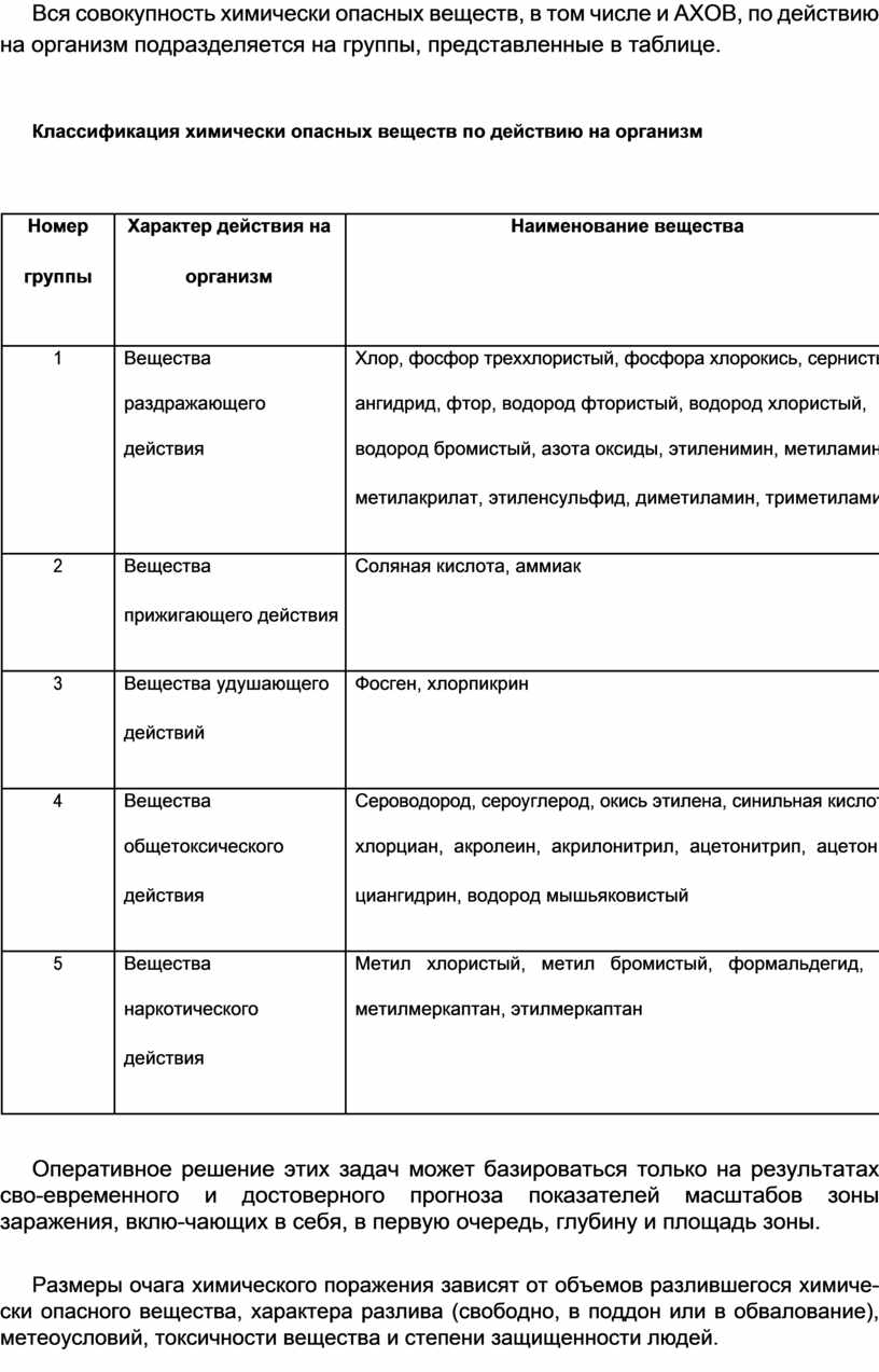 Вся совокупность химически опасных веществ, в том числе и АХОВ, по действию на организм подразделяется на группы, представленные в таблице.