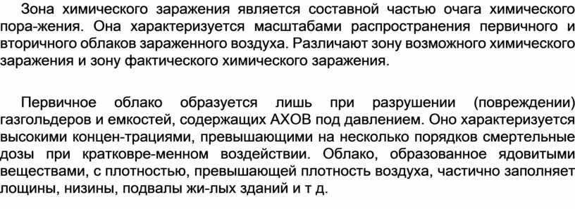 Зона химического заражения является составной частью очага химического пора-жения. Она характеризуется масштабами распространения первичного и вторичного облаков зараженного воздуха. Различают зону возможного химического заражения и зону фактического химического заражения.