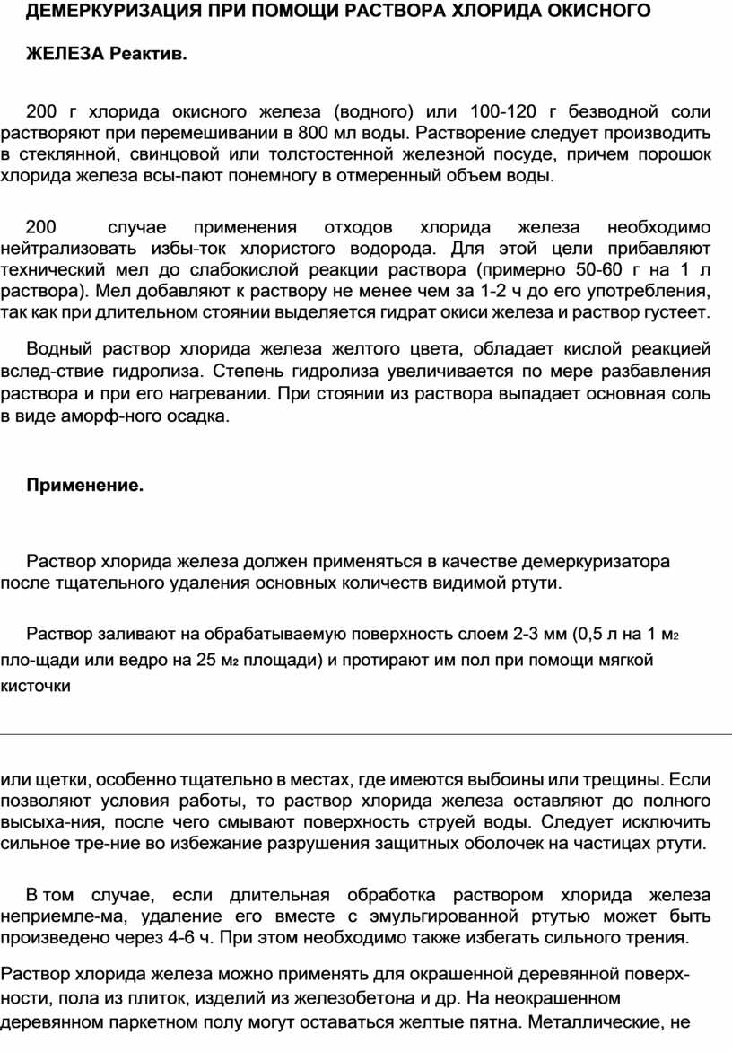 Раствор хлорида железа должен применяться в качестве демеркуризатора после тщательного удаления основных количеств видимой ртути.
