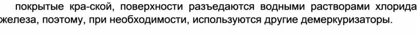 Раствор хлорида железа можно применять для окрашенной деревянной поверх-ности, пола из плиток, изделий из железобетона и др. На неокрашенном деревянном паркетном полу могут оставаться желтые пятна. Металлические, не покрытые кра-ской, поверхности разъедаются водными растворами хлорида железа, поэтому, при необходимости, используются другие демеркуризаторы.