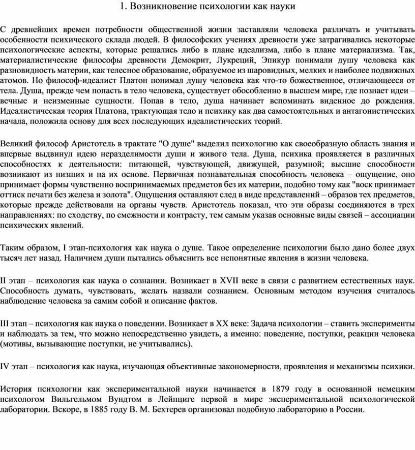 Таким образом, I этап-психология как наука о душе. Такое определение психологии было дано более двух тысяч лет назад. Наличием души пытались объяснить все непонятные явления в жизни человека.