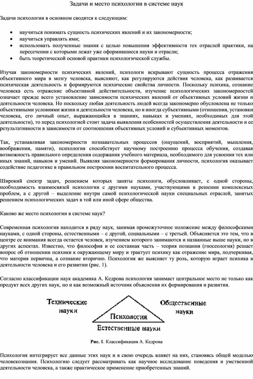 Согласно классификации наук академика А. Кедрова психология занимает центральное место не только как продукт всех других наук, но и как возможный источник объяснения их формирования и развития.