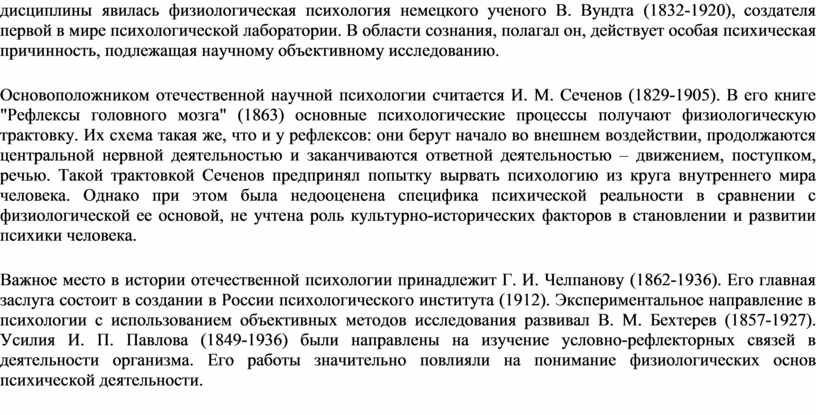 Важное место в истории отечественной психологии принадлежит Г. И. Челпанову (1862-1936). Его главная заслуга состоит в создании в России психологического института (1912). Экспериментальное направление в психологии с использованием объективных методов исследования развивал В. М. Бехтерев (1857-1927). Усилия И. П. Павлова (1849-1936) были направлены на изучение условно-рефлекторных связей в деятельности организма. Его работы значительно повлияли на понимание физиологических основ психической деятельности.