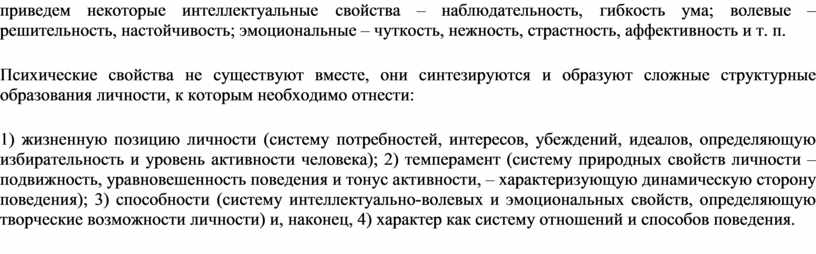 Психические свойства не существуют вместе, они синтезируются и образуют сложные структурные образования личности, к которым необходимо отнести: