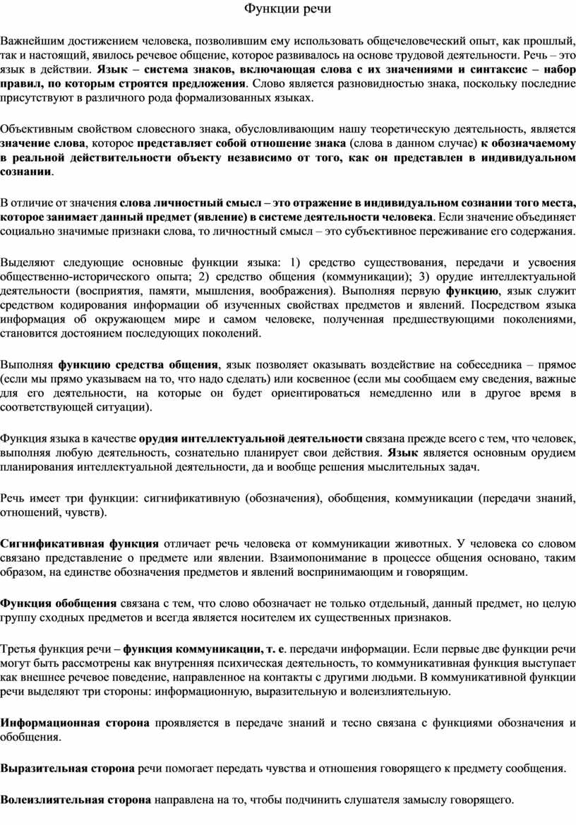 Речь имеет три функции: сигнификативную (обозначения), обобщения, коммуникации (передачи знаний, отношений, чувств).
