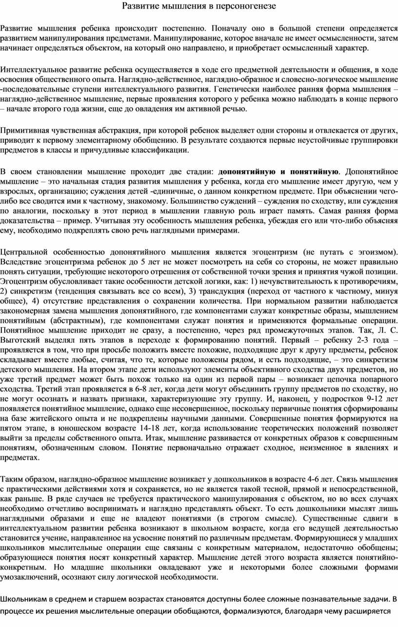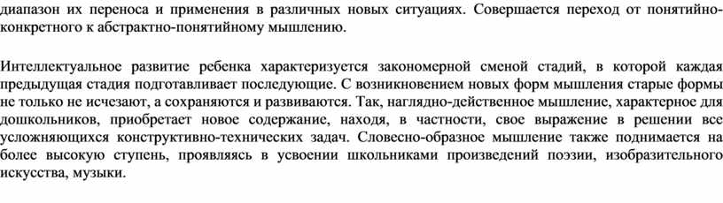 Интеллектуальное развитие ребенка характеризуется закономерной сменой стадий, в которой каждая предыдущая стадия подготавливает последующие. С возникновением новых форм мышления старые формы не только не исчезают, а сохраняются и развиваются. Так, наглядно-действенное мышление, характерное для дошкольников, приобретает новое содержание, находя, в частности, свое выражение в решении все усложняющихся конструктивно-технических задач. Словесно-образное мышление также поднимается на более высокую ступень, проявляясь в усвоении школьниками произведений поэзии, изобразительного искусства, музыки.