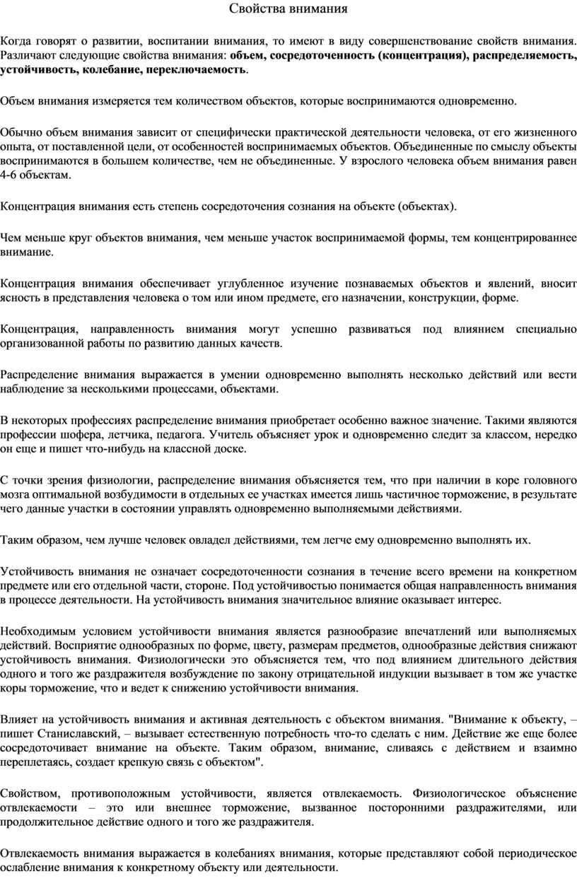 Когда говорят о развитии, воспитании внимания, то имеют в виду совершенствование свойств внимания. Различают следующие свойства внимания: объем, сосредоточенность (концентрация), распределяемость, устойчивость, колебание, переключаемость.