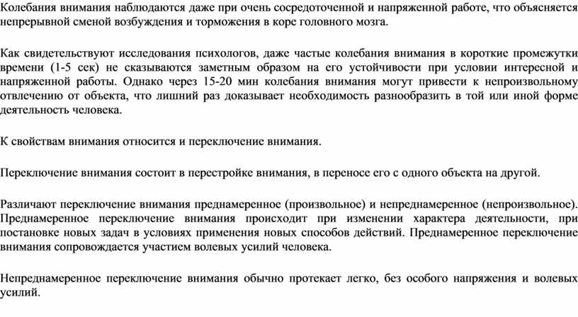 Колебания внимания наблюдаются даже при очень сосредоточенной и напряженной работе, что объясняется непрерывной сменой возбуждения и торможения в коре головного мозга.